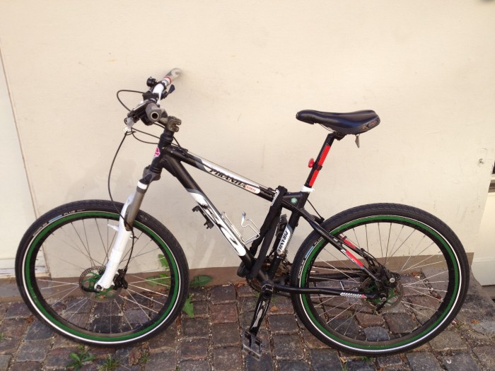 | Cykelen var låst fast i rammen til et cykelstativ udenfor en boligblokk. | |