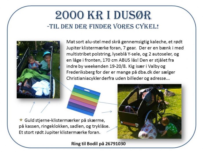 | Sidste år i september fik vi stjålet denne dejlige Christiania cykel. Den blev stjålet fra vores aflåste baggård i Indre by. Peder Hvitfeldts stræde 13. | |