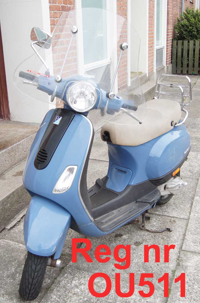 | Min scooter - Vespa LX50 blev stjålet natten ml fredag/lørdag(12/13 sept. 2014) her på Amager -> Smyrnavej 14. Kendetegn: Spec. lyseblå, vindskjold med ridser efter brug af vinkelsliber for at undgå at støde på forlygten(dårligt lavet). Et side spejl i højre side. Hvide ridser på bagkåberne. Lysebrunt plastic sæde. Bagagebager. |