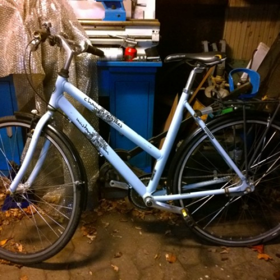 Efterladt op ad et vejtræ i et boligkvarter - typisk for cykler stjålet fra stationens cykelparkering. |