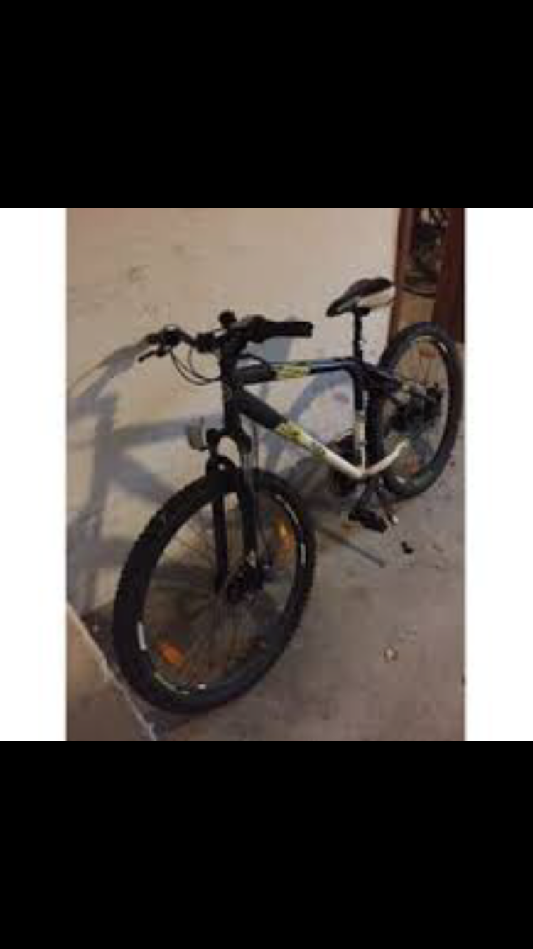 Cykel er en sort Mustang, med lidt grønt samt Hvidt på stellet. Den har brede sorte dæk, bagegebære, og vandflaske holder, begge i sot. 24 gear og skivebræmser, købt i Kvickly.