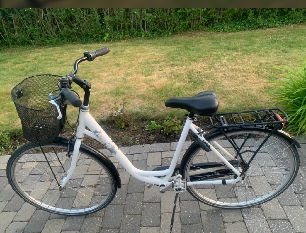 Hvid damecykel stjålet i Silkeborg midtby d. 29. juni. Sort cykelkurv foran.